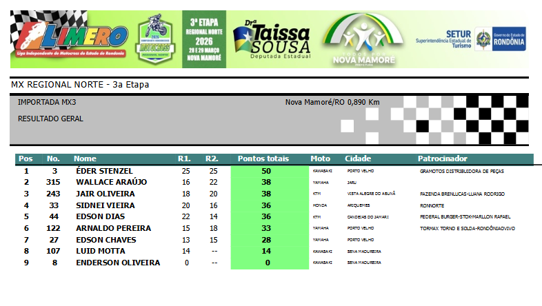 Na categoria MX 3, com pilotos acima dos 33 anos e motos importadas, o destaque foi a vitória incontestável do piloto Éder #3, de Porto Velho, que venceu as duas baterias. Eder lidera o campeonato e é patrocinado pela Gramotos Distribuidora de Peças.
