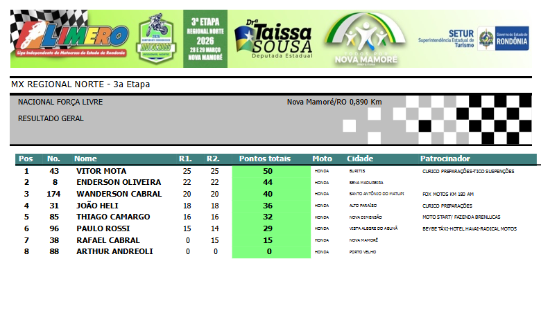 \Na disputa da categoria Nacional Força Livre, o campeão foi Vitor Mota #43, representante de Buritis. Com bom desempenho na sua Honda, o piloto faturou as duas baterias da etapa, garantindo a pontuação máxima de 50 pontos. Vitor acelera com o patrocínio da Curico Preparações e Tico Suspensões.