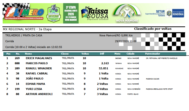 Na segunda colocação, ficou Wallace Araujo #315, de Jaru. Em terceiro, Jair Oliveira #3243, de Vista Alegre do Abunã. Sidinei Vieira #33, de Ariquemes, ficou em quarto, e, em quinto, o piloto Edson KIKE Dias #44, patrocinado por Federal Burguer, Stok Ferramentas e Marllon Rafael.