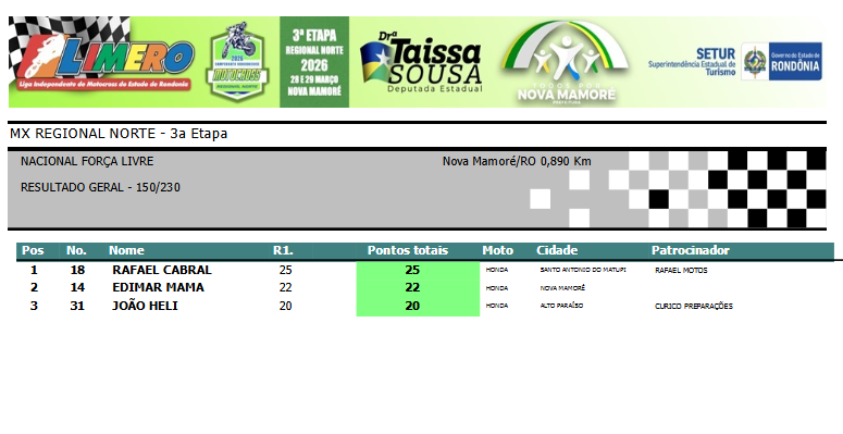 A 3ª etapa do Regional Norte de Motocross em Nova Mamoré superou as expectativas dos organizadores da Liga Independente de Motocross do Estado de Rondônia (Limero). Mais uma vez, arquibancada cheia e dezenas de pilotos no motódromo construído no Rancho Marafon. Nem a forte chuva que caiu na tarde de domingo tirou o brilho da prova, que teve as baterias finais canceladas.