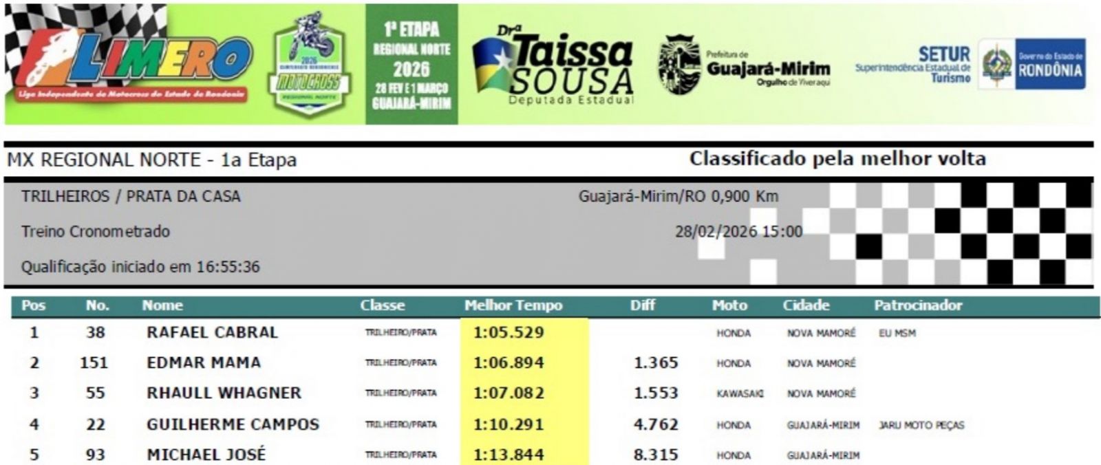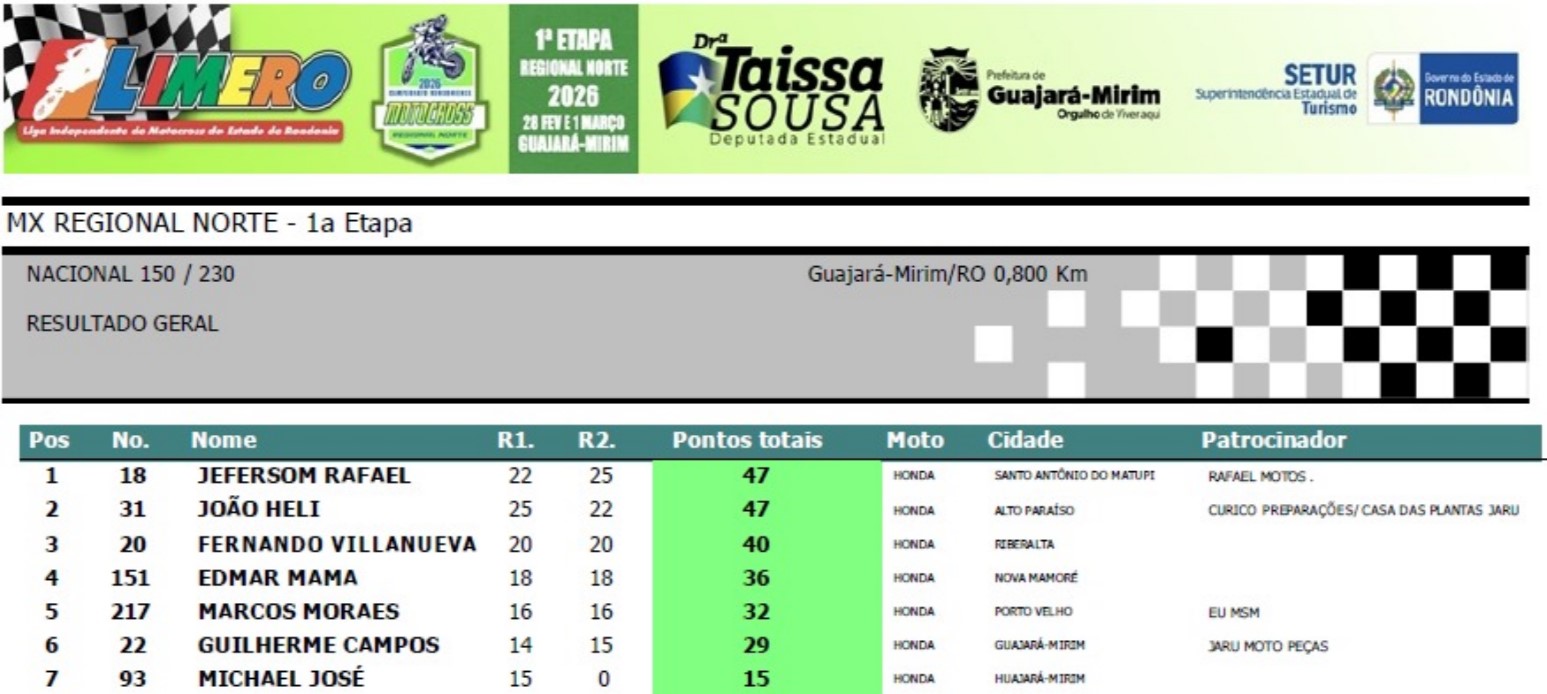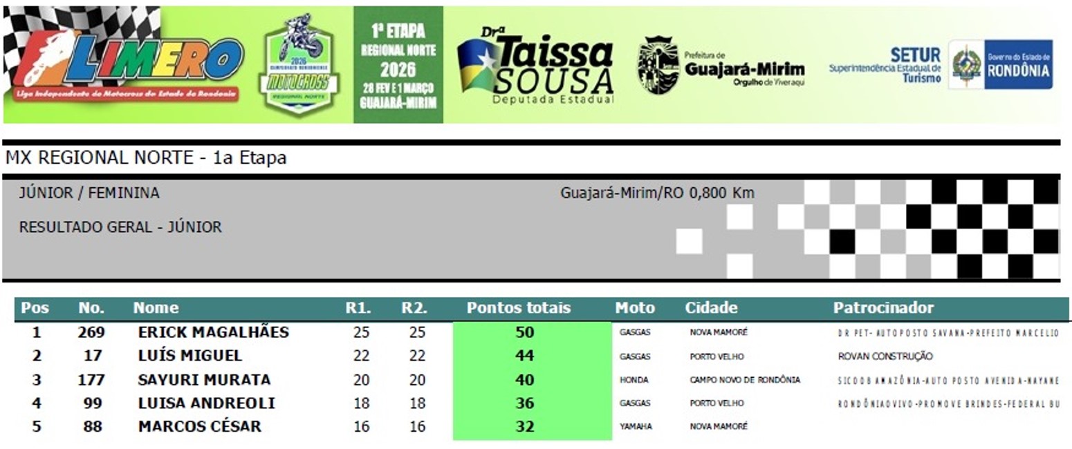 Na quarta colocação a piloto Luisa Andreoli #99 de Porto Velho que mostrou determinação e força de vontade. Luisa foi a vice-campeã do Regional Norte 2025 e na sua modalidade (feminina) ficou em segundo. Completou o pódio o garoto de Nova Mamoré, Marcos Cesar #88.
