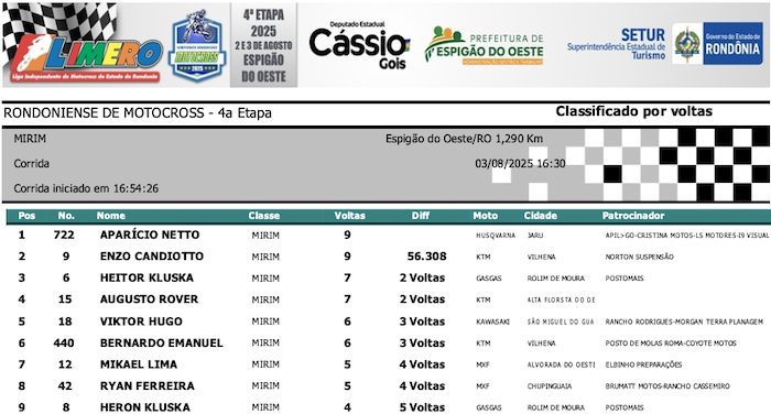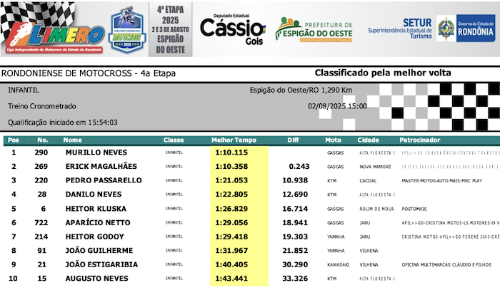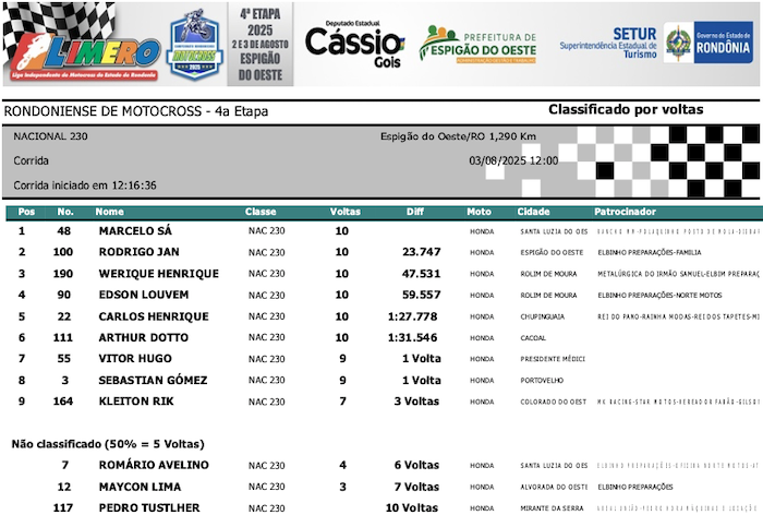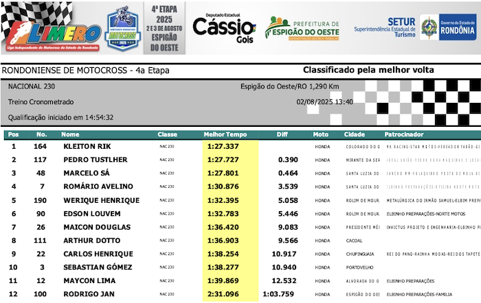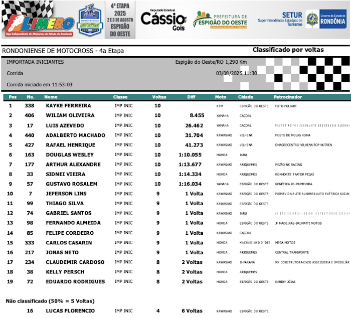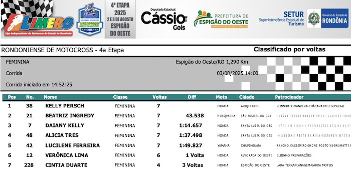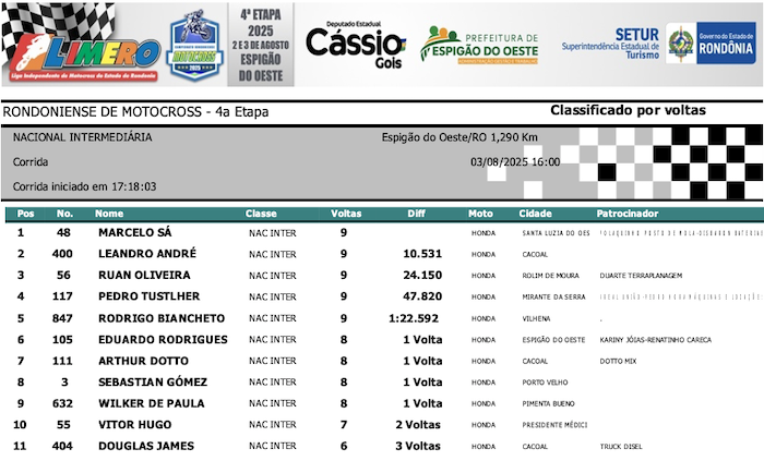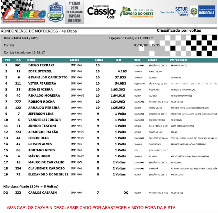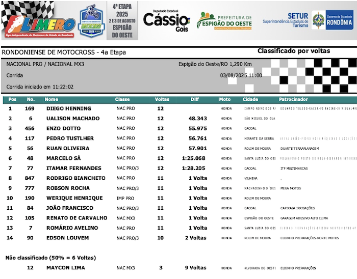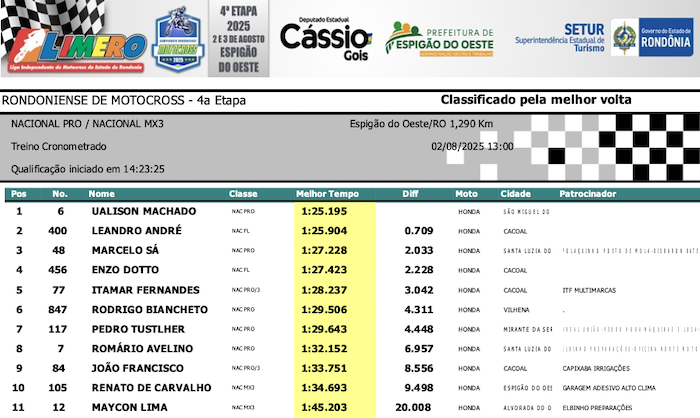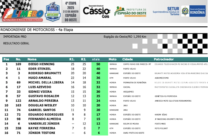 RESULTADOS: Rondoniense de Motocross – 4ª Etapa – Espigão do Oeste