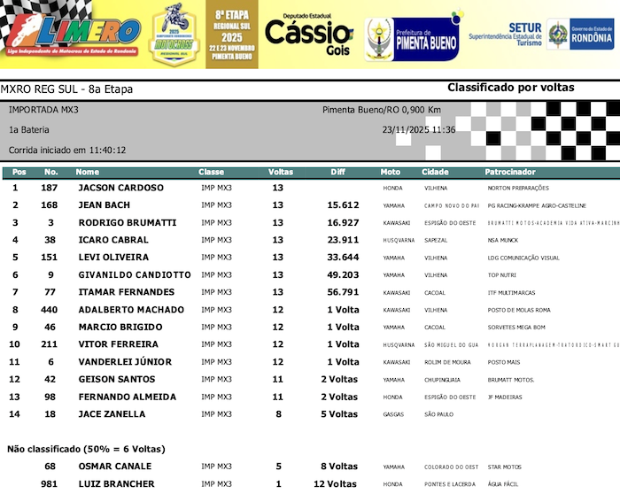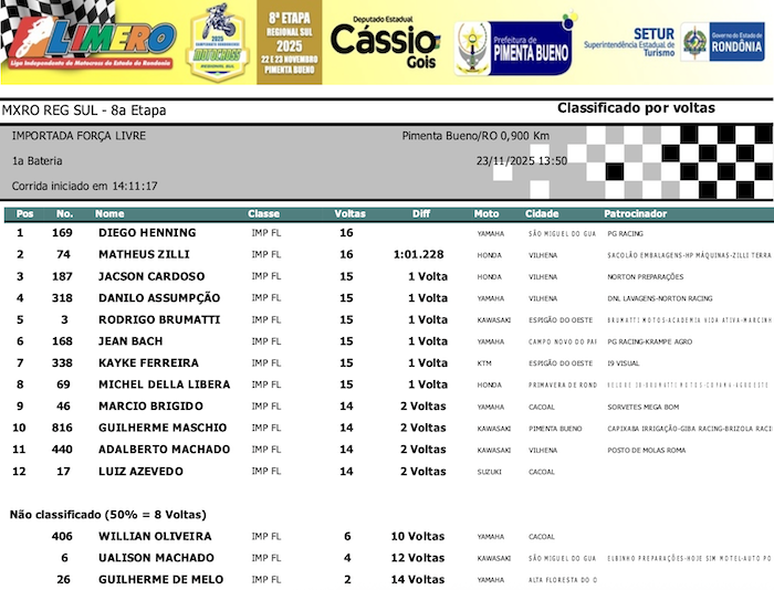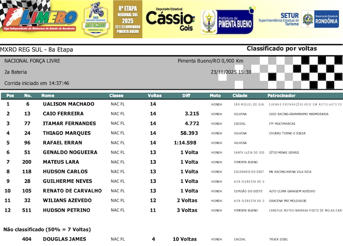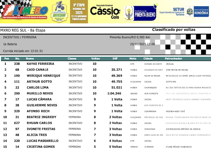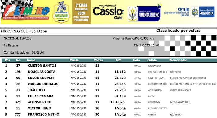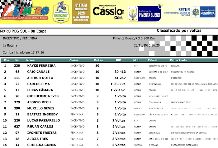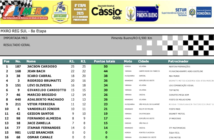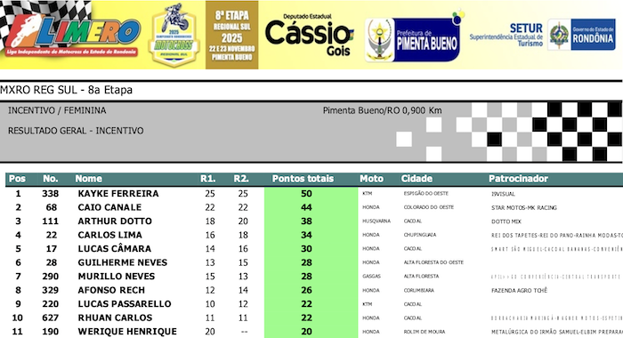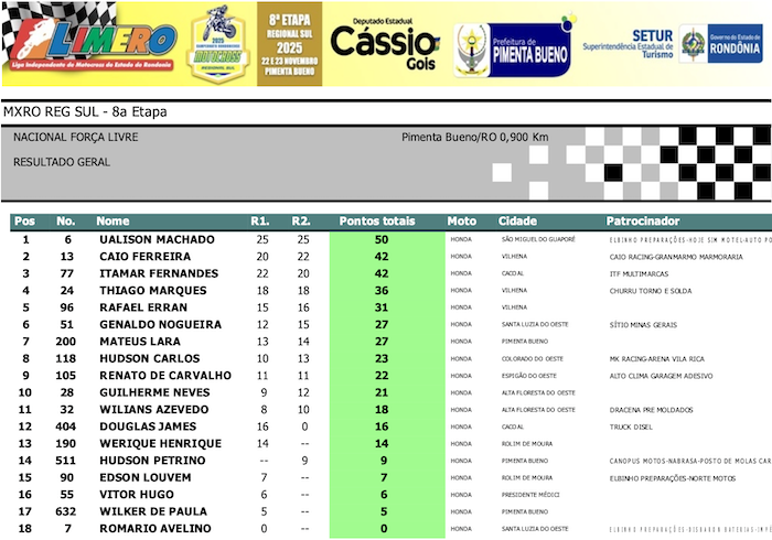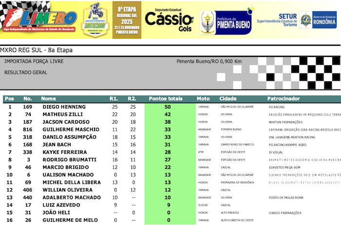 O campeonato rondoniense de motocross regional sul teve sua final neste domingo na cidade de Pimenta Bueno. Confira os resultados da prova e os campeões de cada categoria.