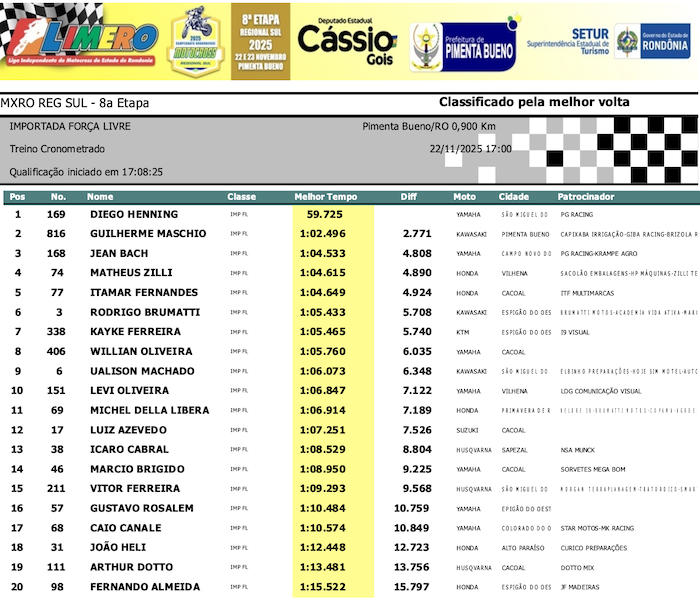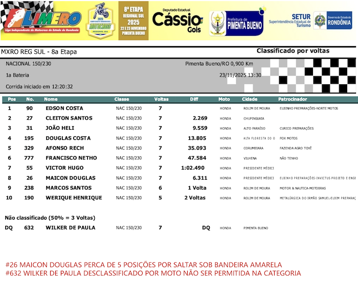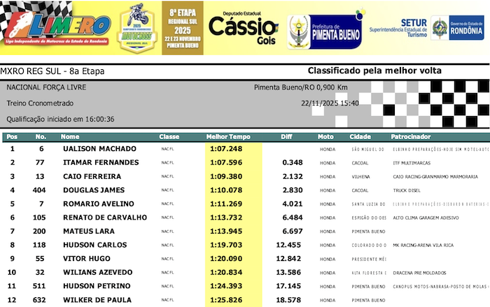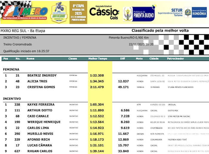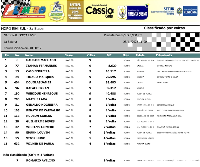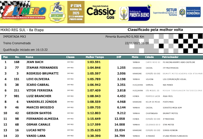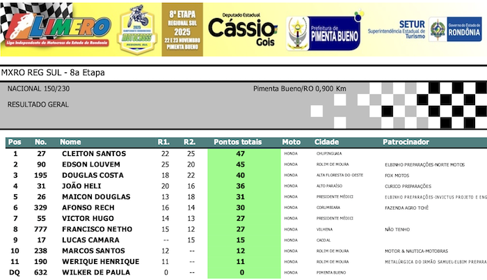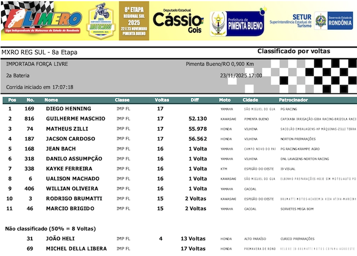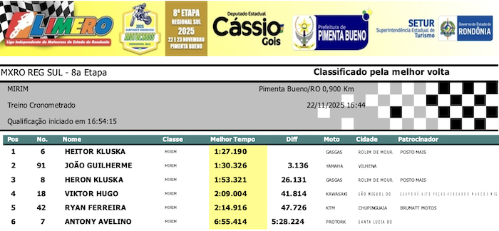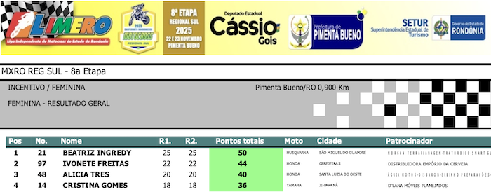 O campeonato rondoniense de motocross regional sul teve sua final neste domingo na cidade de Pimenta Bueno. Confira os resultados da prova e os campeões de cada categoria.